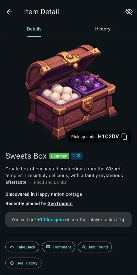 Navigate to GZ using coordinates and clues left by other players. Find the code, enter it in the app, and claim the item. No limit — pick up as many as you can find.